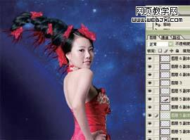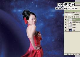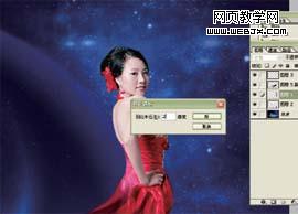 18、新建圖層,將前景色設置成黃色,背景色為紅色,在飄逸的裙紗上適當畫出夢幻星星,最后打上自己需要表達的文字即可。