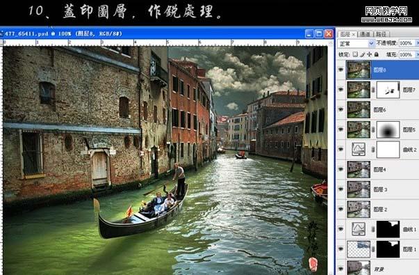 10、新建一個(gè)圖層,蓋印圖層,適當(dāng)?shù)淖鲣J化處理。