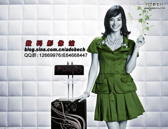 2、打開下圖所示的花紋素材,用魔術(shù)棒摳出來后填充為綠色,復(fù)制進來,移至右手的位置,圖層混合模式改為“正片疊底”,把不要的部分用橡皮擦刪掉。