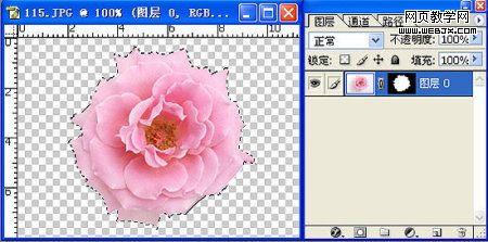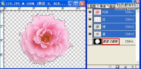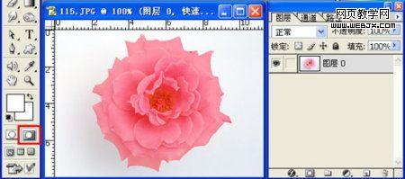 4、單擊工具欄上的“啟用快速蒙板模式編輯”按鈕,會在圖像上形成一個快速蒙板。在默認下,圖像上的選區以外的部分會被50%透明的紅色遮罩,圖層面板上的當前層會以灰色顯示(下圖中我們建立的選擇區為外圍的灰色區域,當啟用快速蒙板模式后,不在選擇區內的花朵被半透明的紅色遮罩)。