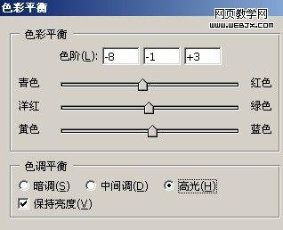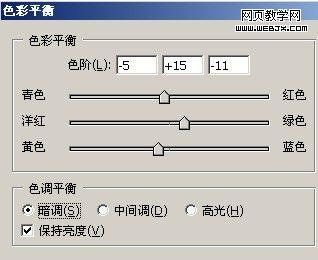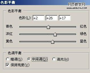 6、最后加一個色彩平衡。參數如圖。再加上蒙版,涂了人物以外的部分。也可以借用紋理圖層中的蒙版,就是按住ctrl單擊紋理蒙版載入它的選區。然后新建一個色彩平衡,是圖層下面的哦!