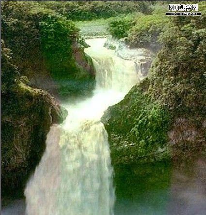 5、打開一瀑布圖,同理,用蒙版加黑畫筆,涂了瀑布以外的部分。再調成紅色。色相飽和度中的色相最大,飽和度也最大,明度低一點。也可以用其它方法調。