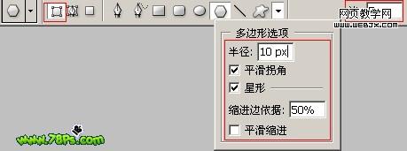 設置多邊形工具(形狀圖層、半徑:10px,勾選:平滑拐角、星形,縮進邊依據:50%)