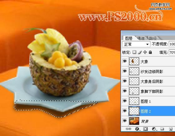 將果盆的素材拖入,調整好位置,在果盆圖層下方新建圖層,使用套索工具勾出陰影的選區