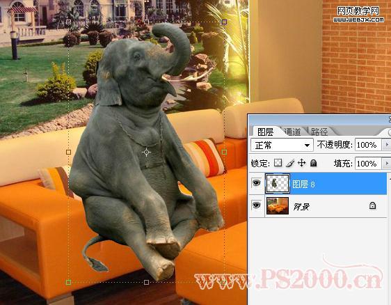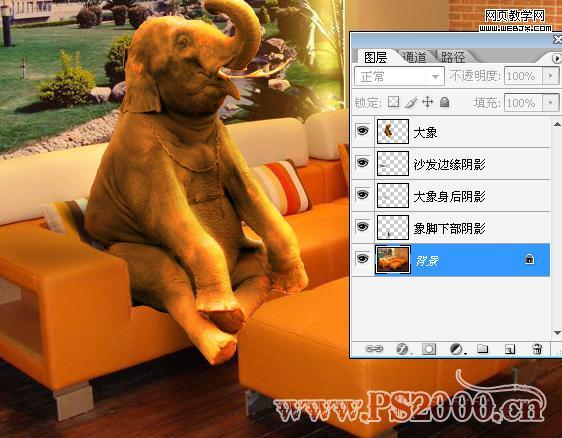 打開沙發素材和象的素材,將象拖入沙發,調整好大小和位置