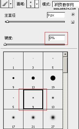 選擇畫筆工具,選中如圖的畫筆,硬度0%,9px