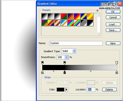 創建一個600*600的一個圓,填充為徑向漸變,中間是黑色,邊緣時透明,效果如下: