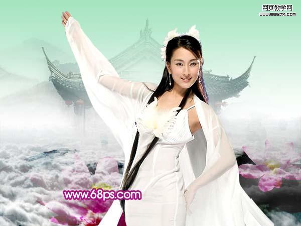12、打開下圖所示的荷花素材,用鋼筆工具勾出來,放到人物圖層的下面,可以多復制幾份,效果如圖23。