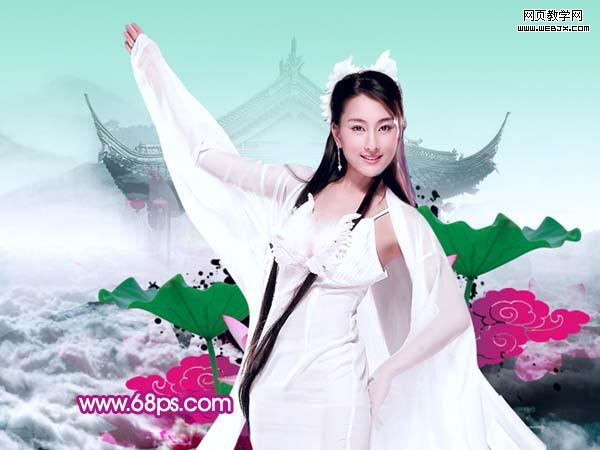 <圖28> 16、最后整體調整下顏色和細節,再裝飾一些小素材(如綢帶及一些水墨筆刷),并適當銳化一下,完成最終效果。