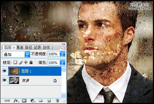 步驟 2、將紋理素材復制到人像中,并將圖層混合模式設為“疊加”。