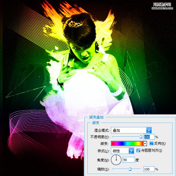步驟 6、在人像層下方創(chuàng)建新圖層,應(yīng)用陣列曲線筆刷繪制出環(huán)繞人像的曲線效果,并使用柔角橡皮擦工具擦除曲線邊緣,得到漸入漸出效果。