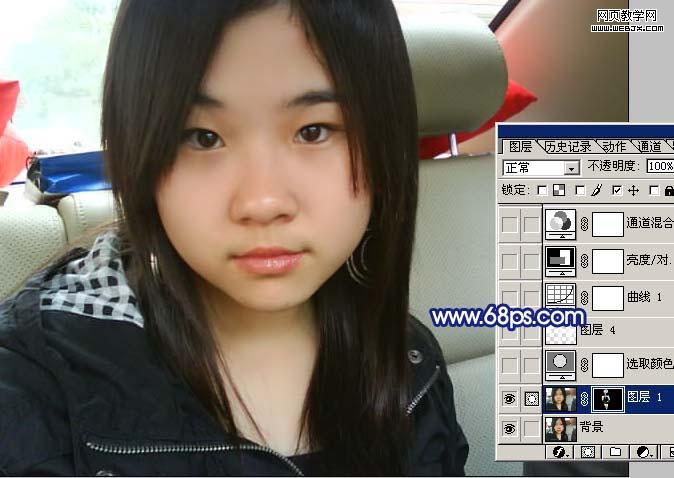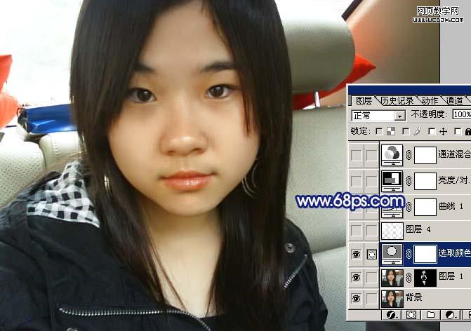 1、打開原圖素材,按ctrl + j 把背景圖層復制一層,執行:濾鏡 > 模糊 > 高斯模糊,數值為4,確定后按住alt 鍵添加圖層蒙版,然后把前景顏色設置為白色,用畫筆在人物臉部及皮膚有雜色的部位涂抹,給人物磨皮,效果如下圖。