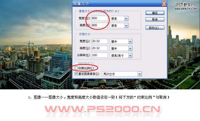 1、打開原圖素材,選擇菜單:圖像 > 圖像大小,把寬度和高度數值設定為一致,設定之前先把約束比例取消勾選。