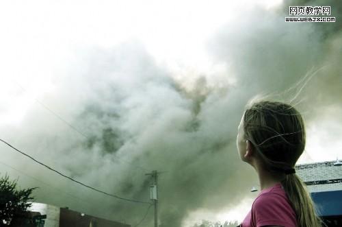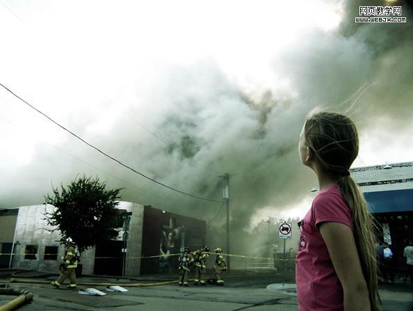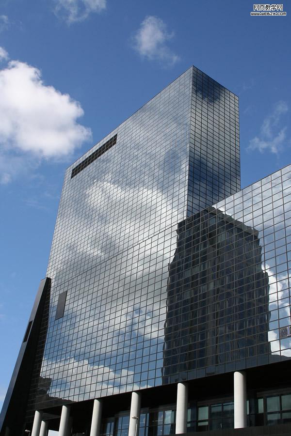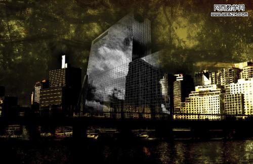 步驟 8、將大廈素材復制到畫布,調整大小并將大廈素材中的天空及大廈的下半部分擦除。