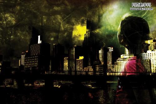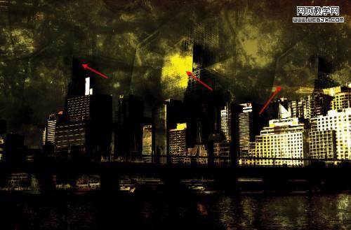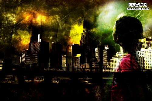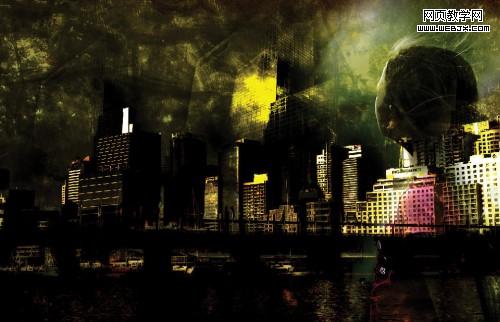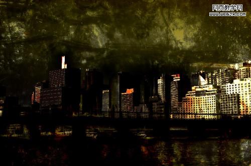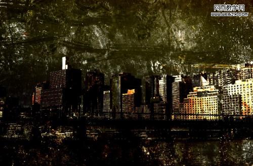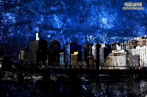 步驟 7、復制城市層,濾鏡 >> 模糊 >> 高斯模糊,半徑設為7。復制模糊層,按下 ctrl + e 合并兩個模糊層并將合并層的混合模式設為“變暗”。