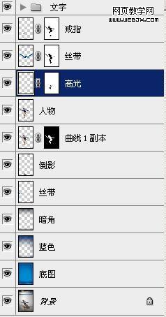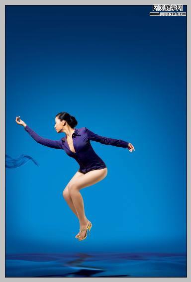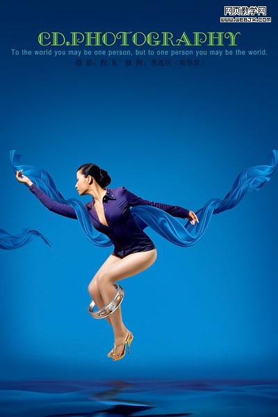 3:調(diào)整皮膚色彩、服裝的色彩,主要用可調(diào)整圖層,然后加上背景素材、倒影等,注意腳背往下繃一點是用自由變換的變形調(diào)整滴