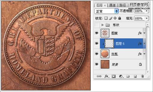 拷貝圖層樣式,粘貼到為硬幣的添加外形與邊緣突起的圖層。