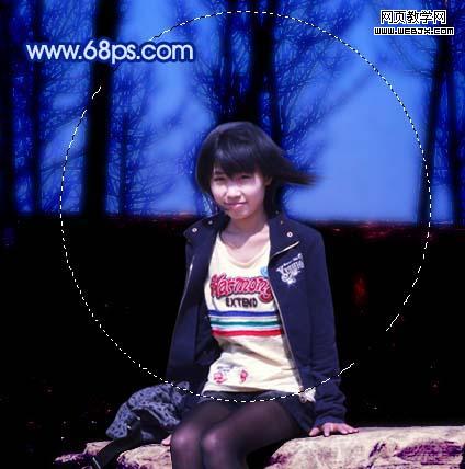 7、在人物圖層下面新建一個(gè)圖層,用橢圓選框工具拉出圖10所示的選區(qū),按ctrl + alt + d 羽化50個(gè)像素,然后填充顏色:#5578e4,取消選區(qū)后效果如圖11。
