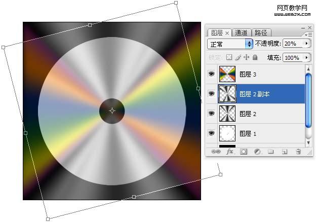 7、將圖層“不透明度”降低,繼續執行“自由變換”命令,旋轉一定角度,來增強反光效果。