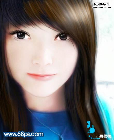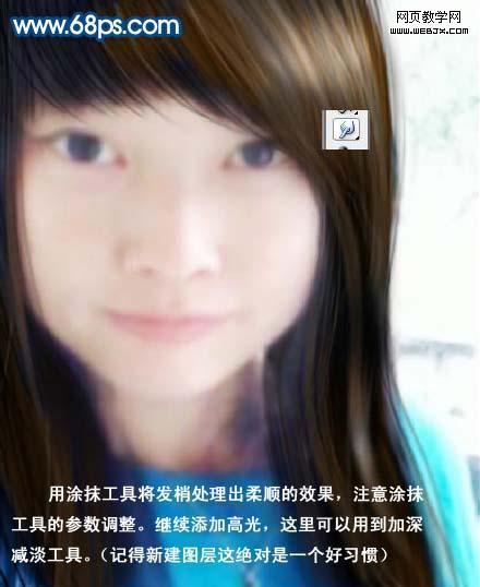 5、用涂抹工具將發(fā)梢處理出柔順的效果,注意涂抹工具參數(shù)調(diào)整。繼續(xù)添加高光,這里可以用到加深/減淡工具。(記得新建圖層這樣絕對是一個號習(xí)慣)。