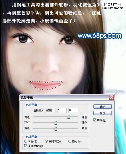 8、用鋼筆工具勾出唇部外輪廓,羽化3個像素,再按ctrl + b 調(diào)整色彩平衡,調(diào)出可愛的粉紅色。(注意唇部外輪廓走向)。