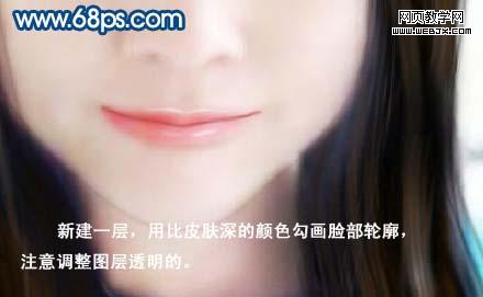 11、新建一層,用比皮膚深的顏色勾畫臉部輪廓,注意調(diào)整圖層透明度。