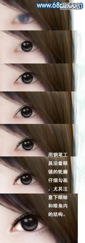 6、用鋼筆工具沿著眼睛的輪廓仔細勾畫,尤其注意下眼瞼和眼膠內(nèi)的結(jié)構(gòu)。
