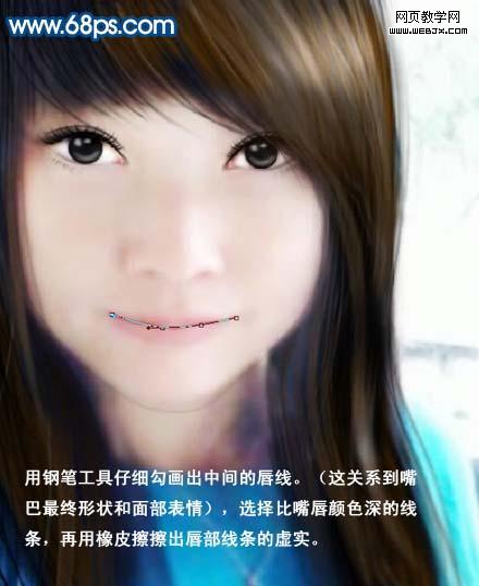 7、用鋼筆工具仔細勾畫出中間的唇線。(這關(guān)系到嘴巴最終形態(tài)和面部表情)。選擇比嘴唇顏色深的線條,再用橡皮擦擦出唇部線條的虛實。