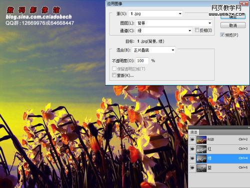 1、打開原圖素材,點通道面板,選擇藍色通道,執行圖像/應用圖像命令。2、選擇綠色通道,執行圖像/應用圖像命令。3、圖層/新建調整圖層/曲線。