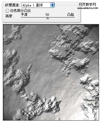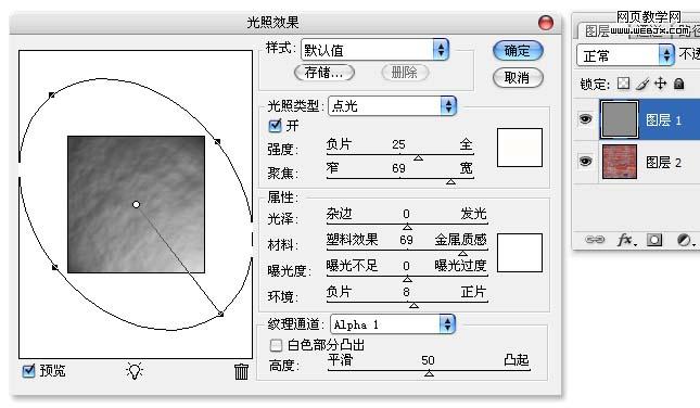 在“磚墻”圖片的上新建一個圖層填充灰色,執行“光照效果”濾鏡,“紋理通道”選擇為“alpha1”。2、復制出“alpha1副本”通道,調整色階,將對比度增強,執行反相,以獲得正確的選區。