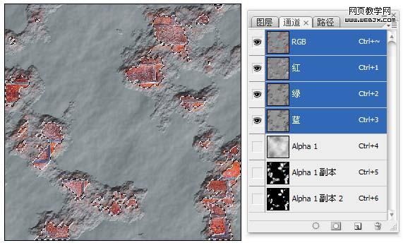 4、在三個通道中,前兩個為作為光照效果的所需的紋理通道,“alpha1通道”是為了獲得墻面的不平整效果,“alpha1通道副本”是為了獲得破損部分,“alpha1通道副本2”為刪除不需要部分的選區通道。