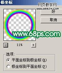 <圖15> 8、執行:濾鏡 > 扭曲 > 極坐標,參數設置如圖16,效果如圖17,彩虹效果出來了。