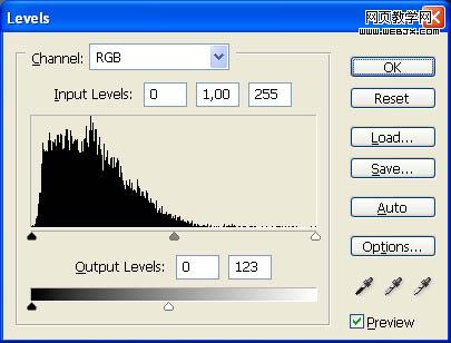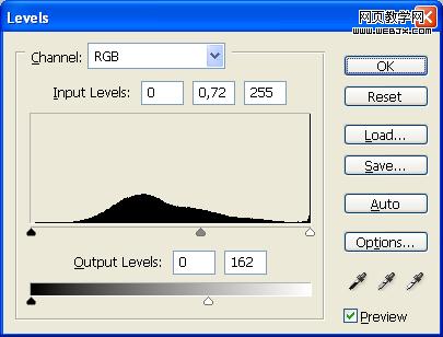 降低透明度。調(diào)整圖層色階0, 0,57, and 255,降低褲子的亮度。
