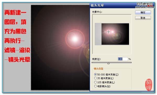 5、新建一個圖層,填充黑色,執行:濾鏡 > 渲染 > 鏡頭光暈,參數設置如下圖。
