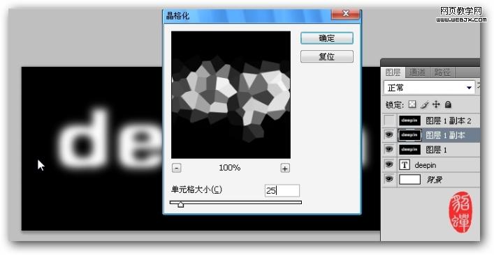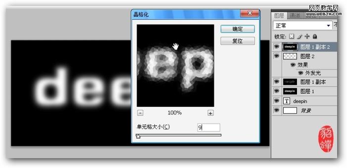 六 顯示并選擇圖層1副本2,執行濾鏡-像素化-晶體化命令