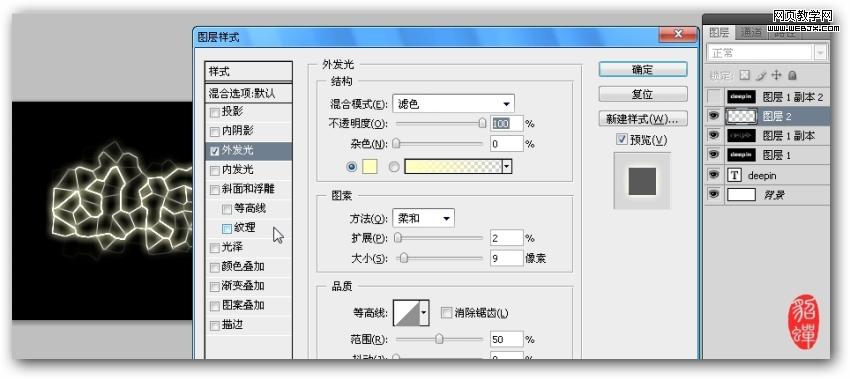 五 切換到通道面板,按住ctrl鍵單擊藍通道調出選區,切換回圖層面板,選擇圖層1副本,按ctrl+j復制選區內圖像到新的圖層,得到圖層2.按圖層樣式按鈕,選擇外發光