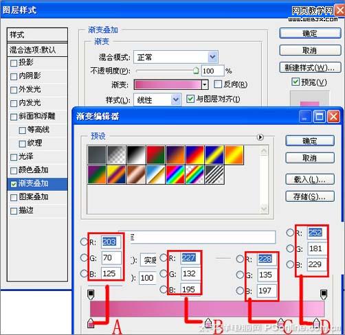 3、點擊圖層樣式,勾選漸變疊加,彈出漸變疊加對話框,設置漸變彈出漸變編輯器,在漸變編輯器設置rgb值:在a處設置rgb值分別為216、95、175,在b處設置rgb值分別為216、95、175,在c處設置rgb值分別為216、95、175,在d處設置rgb值分別為241、193、223,接著點擊確定按鈕,如圖3所示。效果如圖4所示。