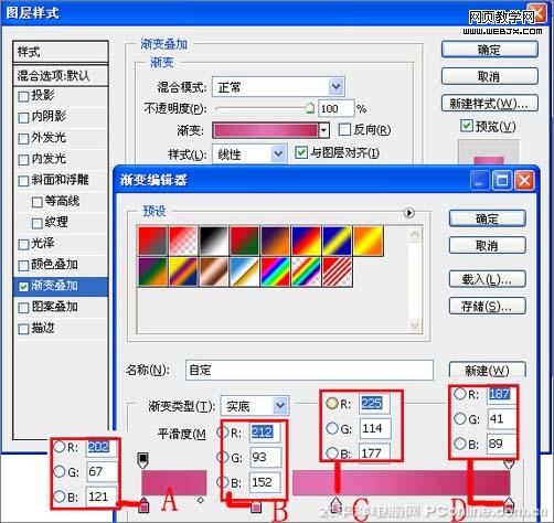 <圖9> 8、點擊圖層樣式,勾選漸變疊加,彈出漸變疊加對話框,設置漸變彈出漸變編輯器,在漸變編輯器設置rgb值:在a處設置rgb值分別為202、67、121,在b處設置rgb值分別為212、93、152,在c處設置rgb值分別為22、114、177,在d處設置rgb值分別為187、41、89,接著點擊確定按鈕,如圖10所示。效果如圖11所示。