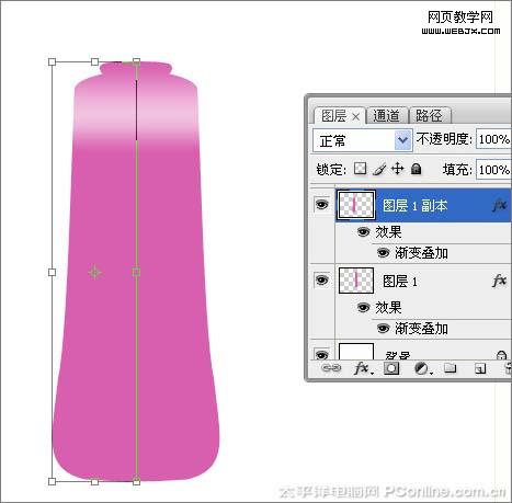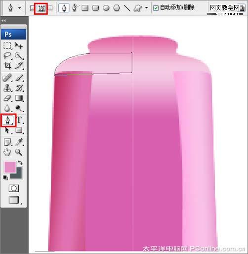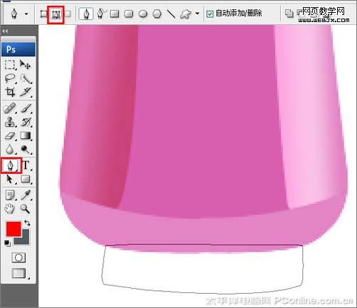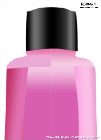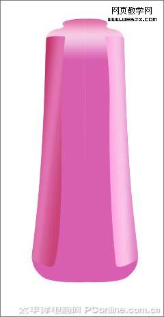<圖13> 11、在圖層面板上單擊創建新圖層按鈕 ,新建一個圖層,在工具欄中選擇鋼筆工具,在工作區畫出洗發水瓶的底側形狀,在工具箱中選擇設置前景色,設置前景色的顏色rgb值分別為227、132、195,填充給洗發水瓶的底側形狀,按鍵盤快捷鍵alt+delete填充,接著按鍵盤快捷鍵ctrl+d取消選區,如圖14所示。