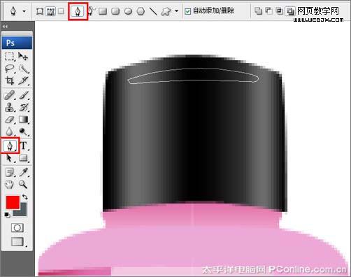 <圖21> 17、在圖層面板上單擊創建新圖層按鈕 ,新建一個圖層,命名為高光,在工具欄中選擇鋼筆工具,在工作區畫出洗發水瓶的瓶口上繪制出無規則的形狀,如圖22所示。