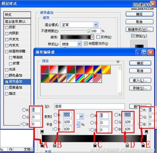 <圖16> 14、選中瓶口圖層,點擊圖層樣式,勾選漸變疊加,彈出漸變疊加對話框,設置漸變彈出漸變編輯器,在漸變編輯器設置rgb值:在a處設置rgb值分別為0、0、0,在b處設置rgb值分別為109、109、109,在c處設置rgb值分別為0、0、0,在d處設置rgb值分別為109、109、109,在e處設置rgb值分別為0、0、0,接著點擊確定按鈕,如圖17所示。效果如圖18所示。