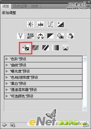 12、下面我們將見識(shí)一下photoshop cs4的新特性了——調(diào)整調(diào)板。(林棲者語:沒有安裝cs4的朋友們不用擔(dān)心,我們使用cs3及以前版本的調(diào)整圖層功能同樣可以完成本步的操作。只不過在cs4中將色相和飽和度、色階、曲線等調(diào)整層以按鈕的形式展現(xiàn)出來了,這無疑將提高我們的工作效率。)下圖就是所謂的【調(diào)整調(diào)板】,點(diǎn)擊紅色方框內(nèi)的 【創(chuàng)建新的反向調(diào)整圖層】按鈕,新建一個(gè)反向調(diào)整層。