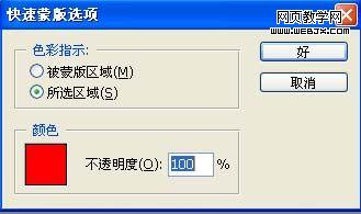 我們來修改快速的設(shè)置,使不希望保留的背景灰色被遮住,在工具欄上雙擊“啟用快速蒙板模式編輯”按鈕 ,彈出快速蒙板對話框,設(shè)置色彩指示為“所選區(qū)域”(即所選擇的區(qū)域被顏色遮住),由于顯示的部分以綠色為主,那么我們可以將顏色設(shè)置為其互補(bǔ)色紅色,方便對比結(jié)果,將不透明度改為100%(選擇區(qū)完全被遮住)。
