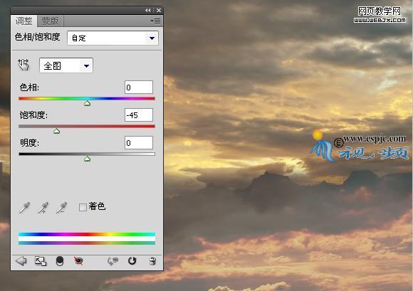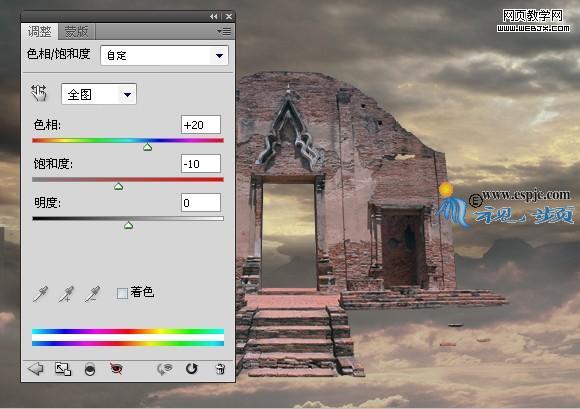 4、按照上一步的操作方法對圖像進行“色相/飽和度”調整,但是不創建剪貼蒙版,并設置其對話框如圖6所示,得到如圖7所示效果。