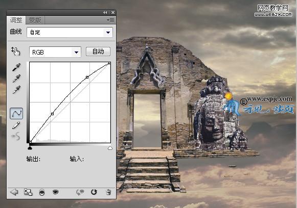 3、單擊創建新的填充或調整圖層,在菜單中選擇“曲線”命令,并設置其對話框如圖4所示,確定后在圖層調板里得到“曲線1”圖層。按ctrl+alt+g常見剪貼蒙版,得到如圖5所示效果。
