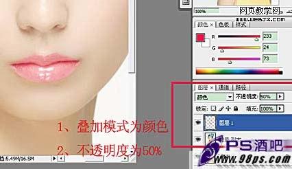 四,把圖層混合模式改為“顏色”,圖層不透明度改為:50%,完成唇紅部分制作。