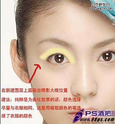 二,把前景色彩設置為:#f3e7aa,用畫筆在新建圖層上畫出眼影大概位置。效果如下圖。