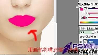 三,把前景色彩設置為:#fe0587,用畫筆將嘴唇部分涂滿。