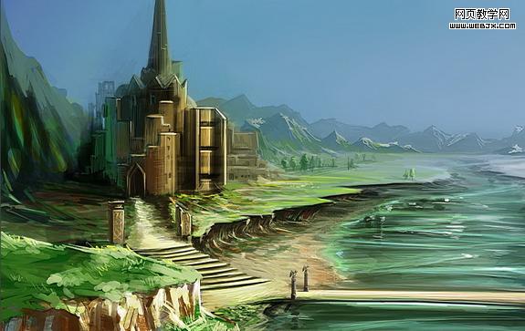 7、現在刻畫左側城堡。把你心中的設計鋪到畫布上吧!注意全局的統一。