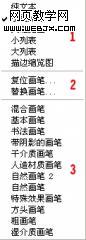 以畫筆為例,要載入ps自帶的畫筆就點擊3處的三角符號按鈕,我們可以看到三欄內容